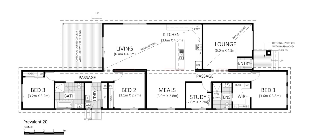 The basic floor plan includes three bedrooms along with a separate study. Capitalising on the popularity of the Prevalent 1 home design, the Prevalent 20 goes one step further to add an additional bathroom, in addition to moving the secondary bedrooms away from the master bedroom in order to create more privacy for family members. The master bedroom has its own walk-in robe, along with ensuite. On the opposite side of the home is where the two remaining bedrooms reside, along with the family bathroom and a separate laundry.