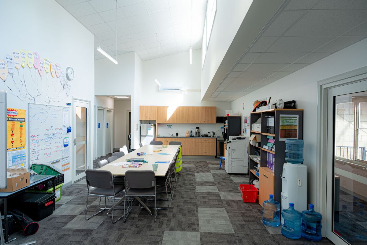 Extended eaves on the elevated roof section, soften the natural light and ventilation entering the new spaces via the North and East facing highlight windows. Internal acoustic treatments and the oblique wall and ceiling angles are used to reduce reverberation and enhance the appealing spaciousness of the building.