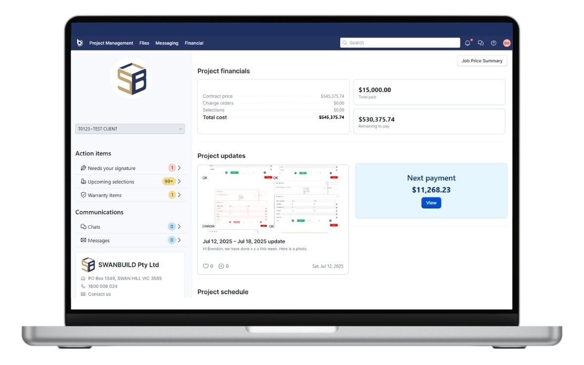 With Buildertrend, you gain access to your own Client Portal, designed to simplify every step of the way. From completing the crucial Colours & Selections process to answering frequently asked questions, your Client Portal is your personalised hub for all project-related activities.